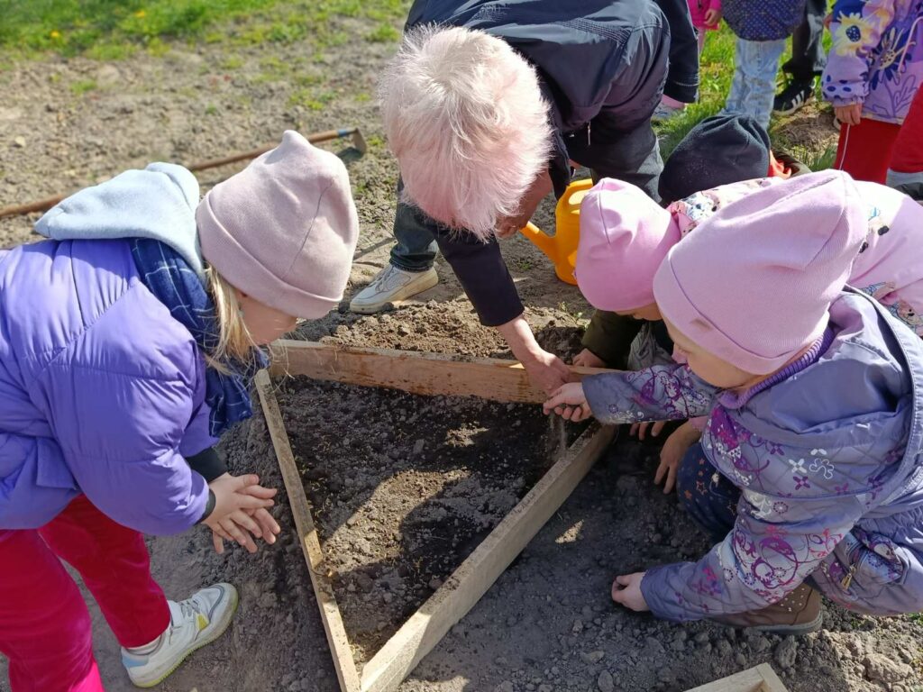 Ребята из группы “Ромашки” с воспитателем Валерией Валентиновной готовятся к посеву зерноаых на на станции”Огород”